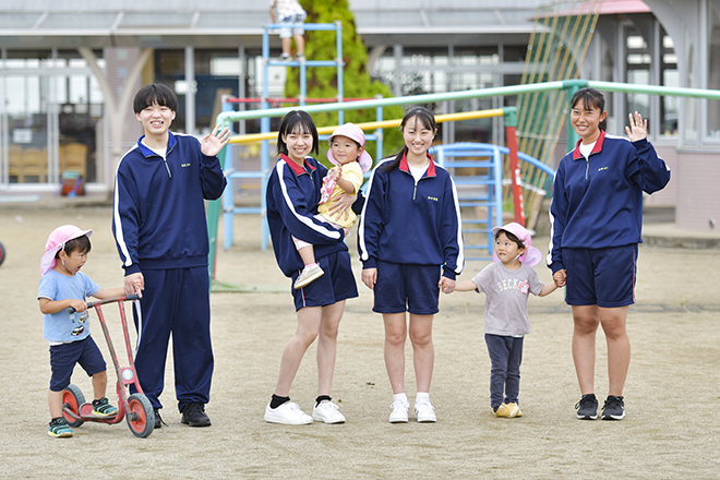 高大連携の授業で、次の進路につながる経験と知識を身に付けられる他、附属幼稚園での体験学習を通し、子供たちとの関わり方や幼稚園教諭の指導を肌で感じることができます。