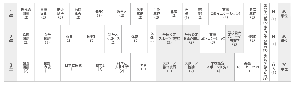 国数英理社の5教科を基本に、体育系の大学や各種専修学校等への進学、就職に対応したカリキュラム |