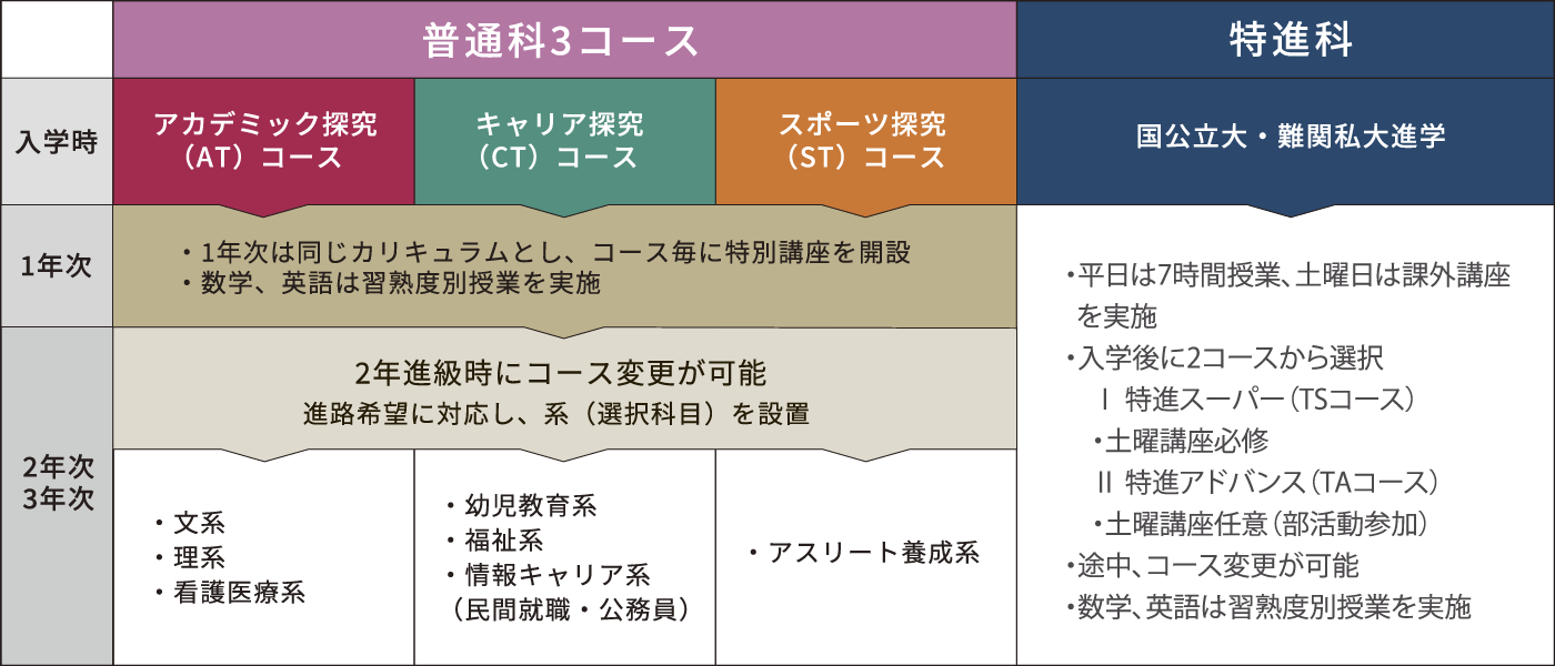 充実したキャリア教育により一人ひとりの可能性を広げ、普通科3コースは2年進級時にコース変更が可能になります。 |