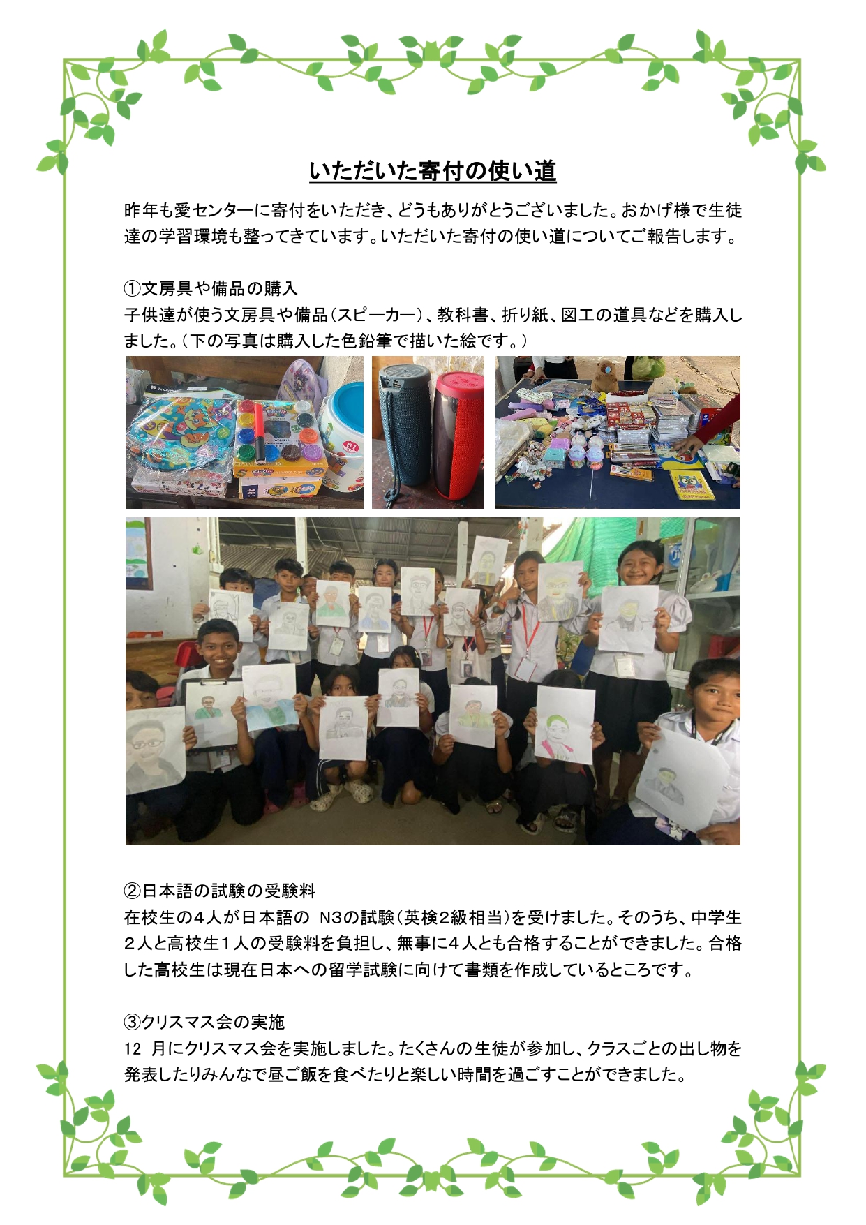 お知らせ カンボジアからのメッセージ 2026年03月09日 本校では毎年、城北祭(文化祭)の各クラス・部活動企画による収益の一部を、カンボジアのフリースクールである愛センターに寄付しています。 感謝のメッセージと共に愛センターの様子を紹介する画像が届きました。